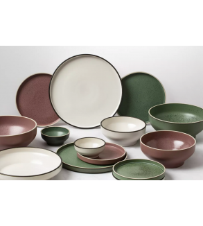 Minimalist shapes and bold colours inform the design of Mod, the new stoneware range by Luzerne. Colours Smokey Basil, Smokey Plum and Dusted White feature accented banding and subtle glaze spatters, inviting a mix-and-match approach to your place setting.
